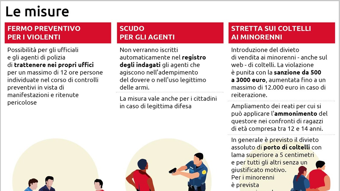 Dal fermo preventivo per bloccare i violenti prima che arrivino in piazza alla stretta sui coltelli per i minorenni, fino allo ‘scudo’ ma non solo per gli agenti, anche per tutti i cittadini, e alle zone rosse. Spaziano su più fronti le norme pronte ad entrare nel nuovo pacchetto sicurezza e sulle quali sono in corso in queste ore, oltre a quelle politiche, diverse riunioni tra i tecnici dei vari ministeri per analizzare nel dettaglio le misure e decidere quali far confluire nel decreto legge e quali nel disegno di legge.